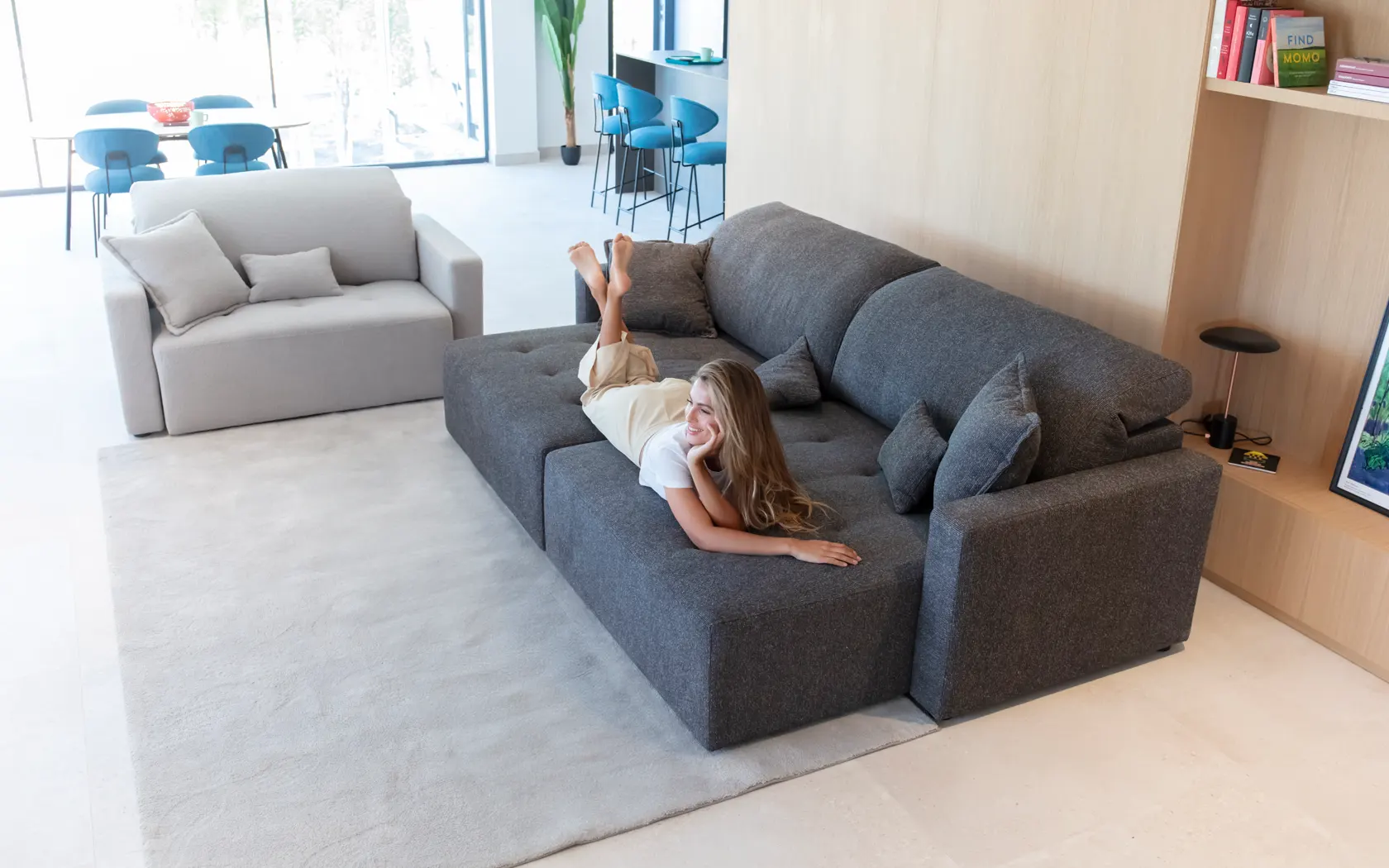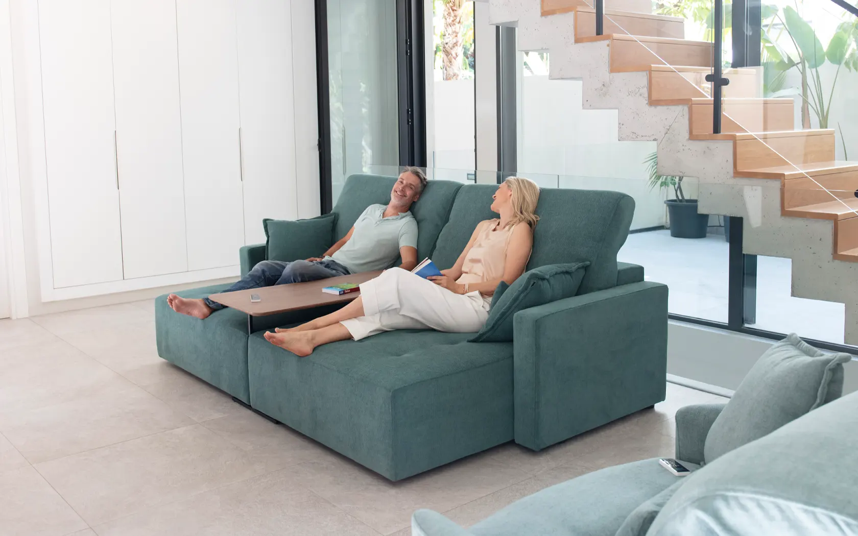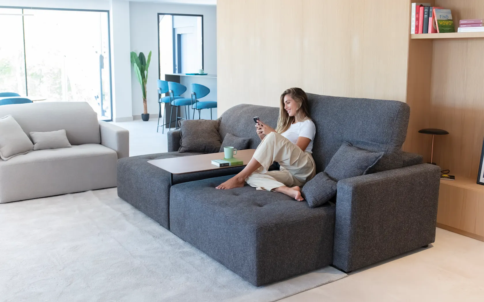 PARADIS is not a conventional pull-out sofa. It will allow you to have a huge chaiselonge or a sofa with a depth of just 99 cm. Its seat increases up to 60 cm with a motorised pull-out system.